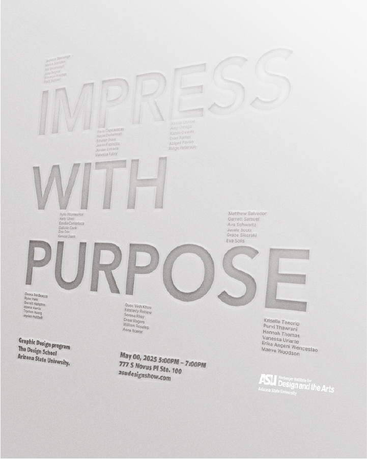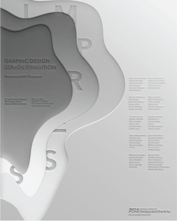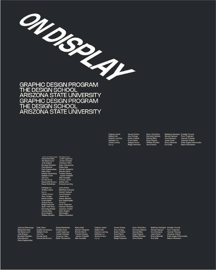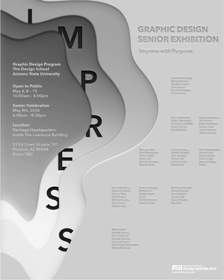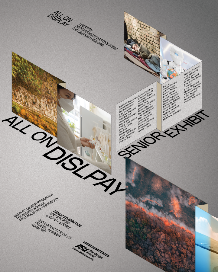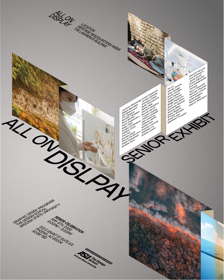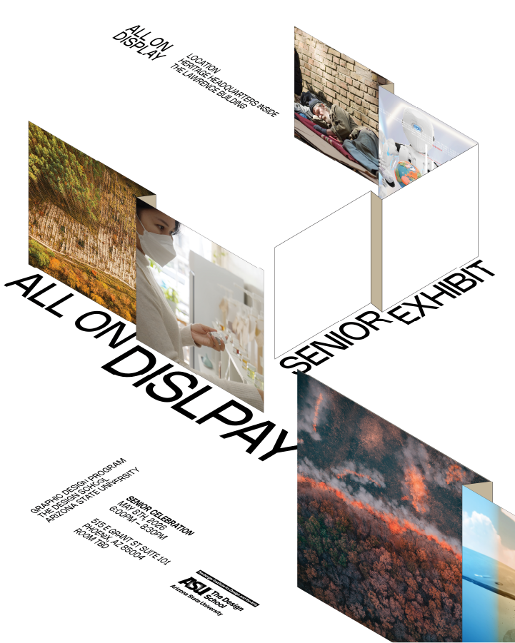 Graphic Design Seniors at Arizona State University are more connected than ever. As a close knit community of only 62 students we aim to weave individuals’ perspectives into shared dialogues/ showcase the interconnected nature of various social issues and scientific breakthroughs” at this year’s Annual Senior Exhibition. Four years of diligent practice and
